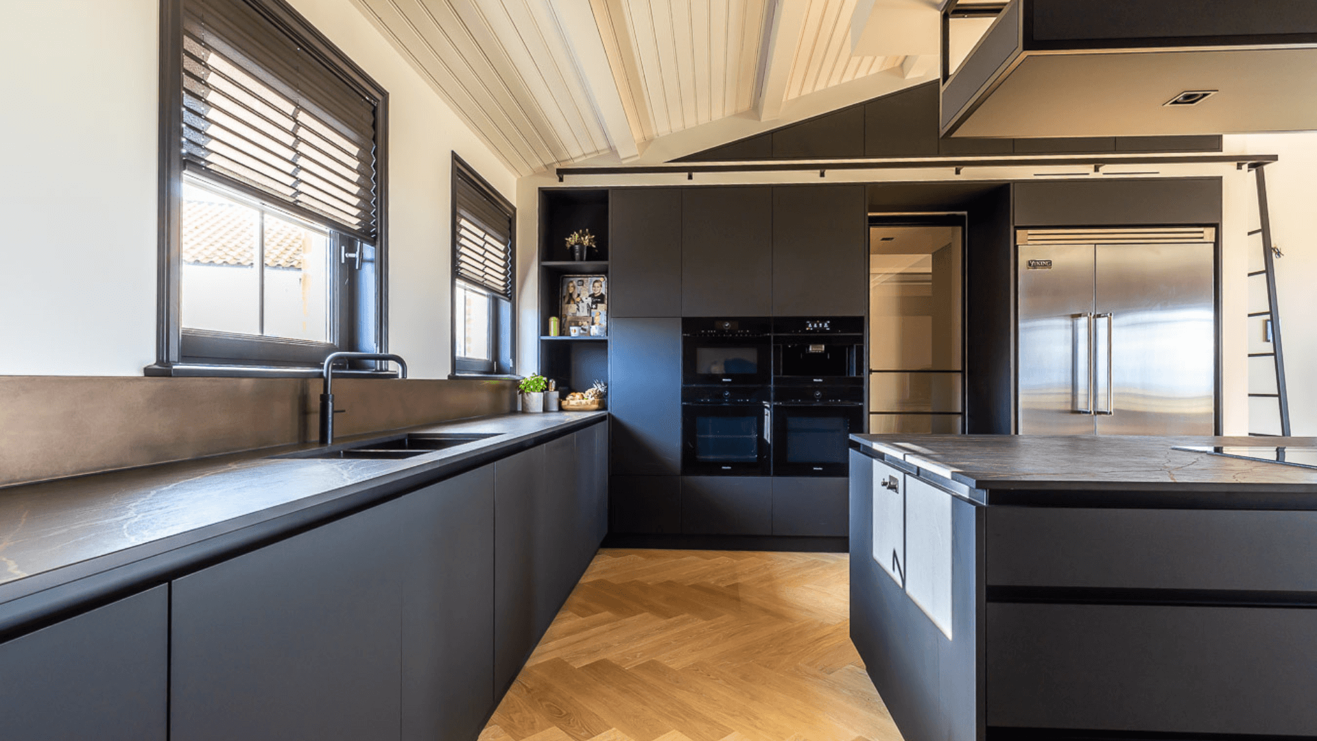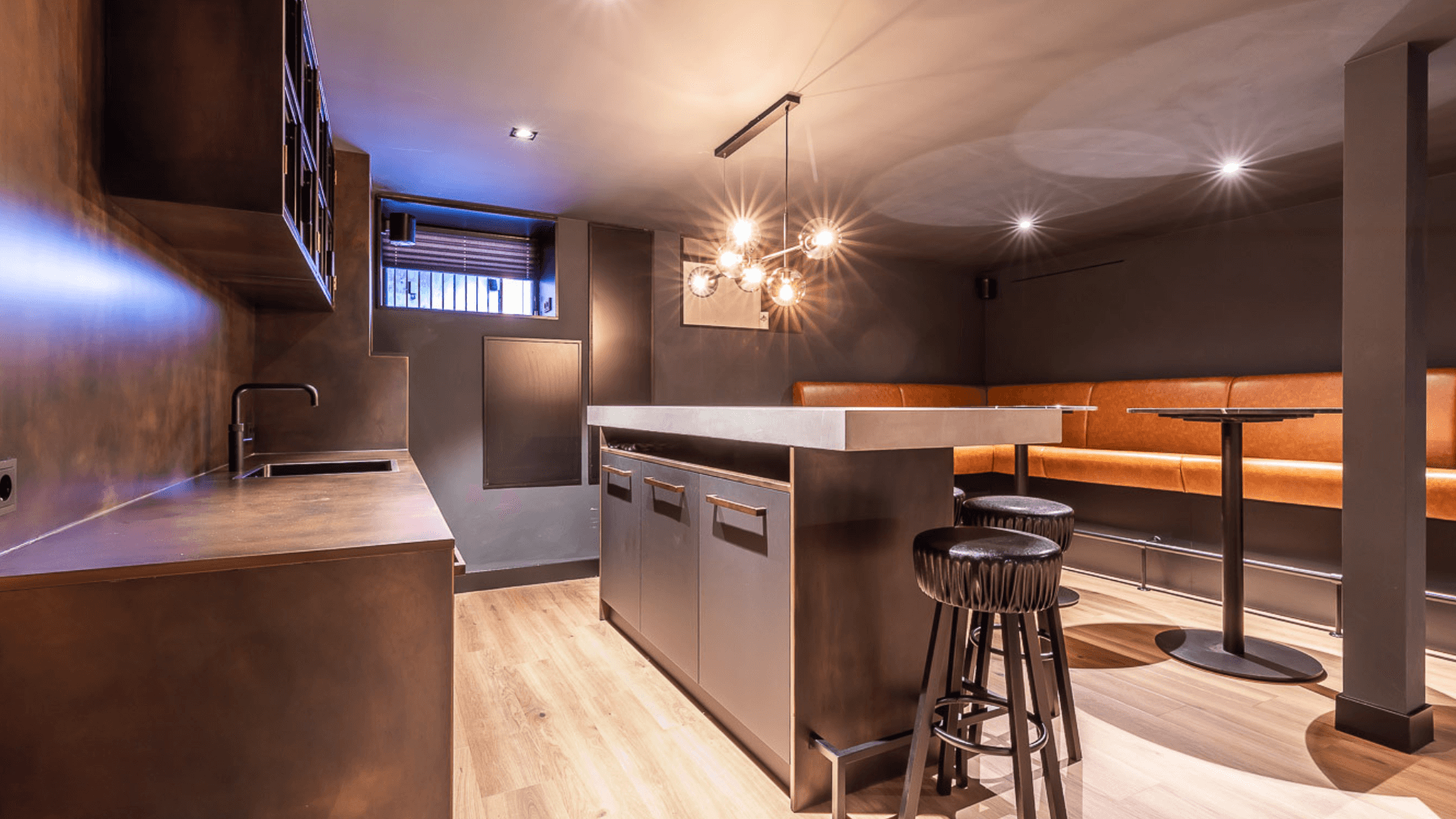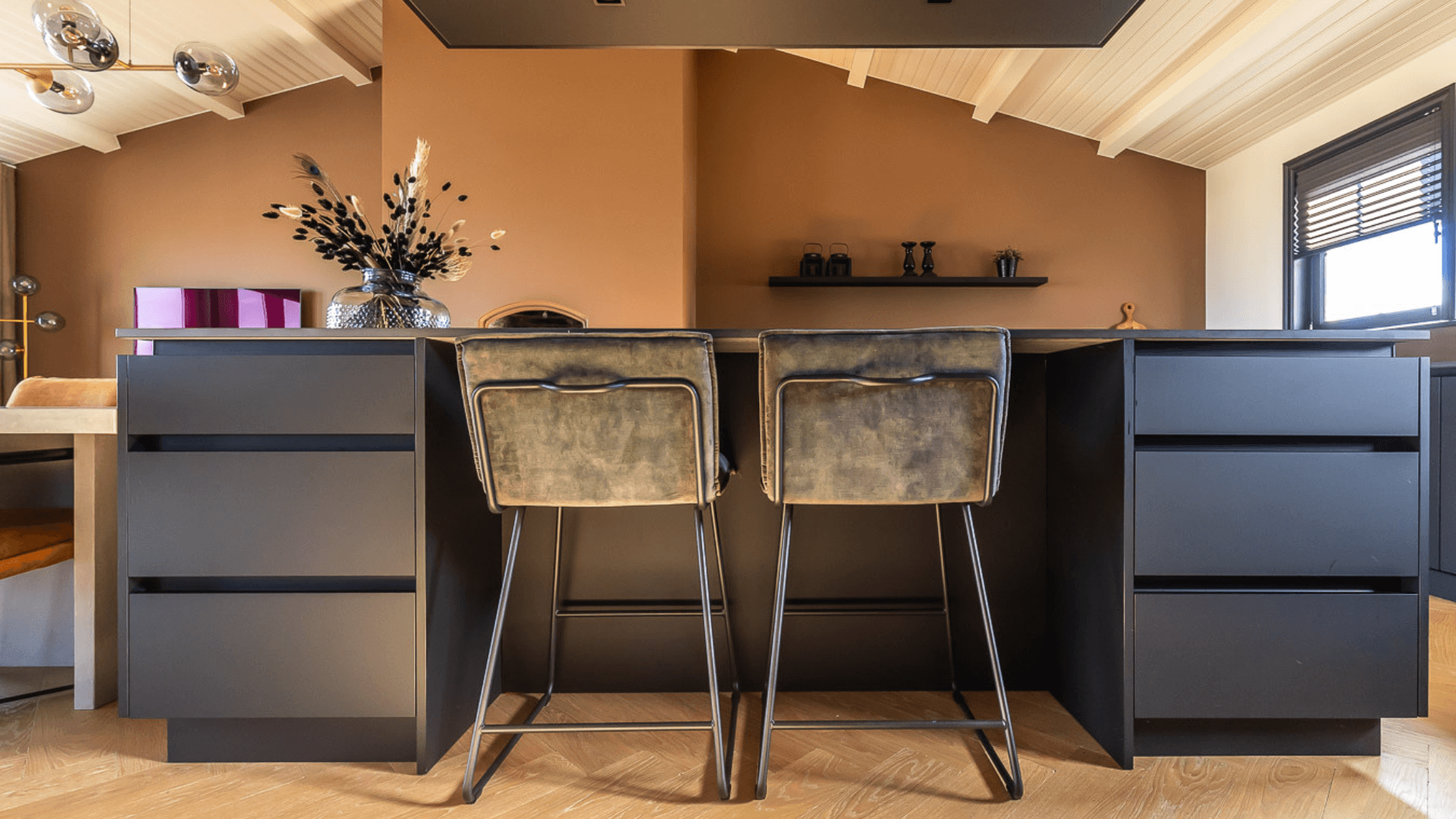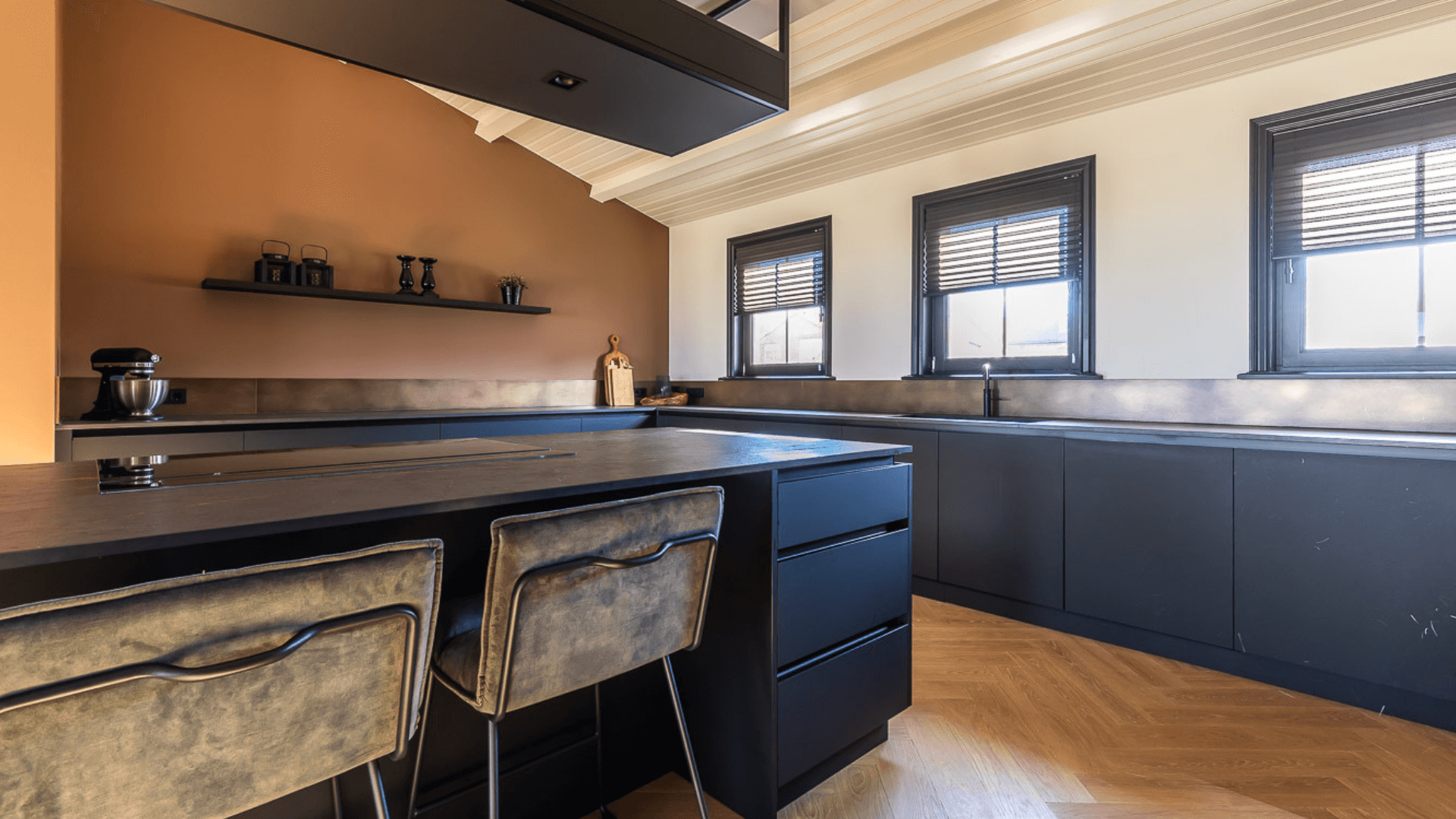 Een woonkeuken, badkamer, woonkamer en mancave hebben allen hun eigen functie en mogen daardoor ook een eigen uitstraling hebben. Waar de mancave en woonkeuken bruisende plekken zijn waar geleefd wordt, is een badkamer juist een plek waar je omarmt wordt door rust. Het maatwerk interieur in de badkamer werd daarom licht en luchtig, waarbij er voor de mancave en woonkeuken gekozen werd voor donkere materialen en een industriële look. Door op subtiele wijze te spelen met afwerkingen sluiten de ruimtes nu alsnog heel goed op elkaar aan!