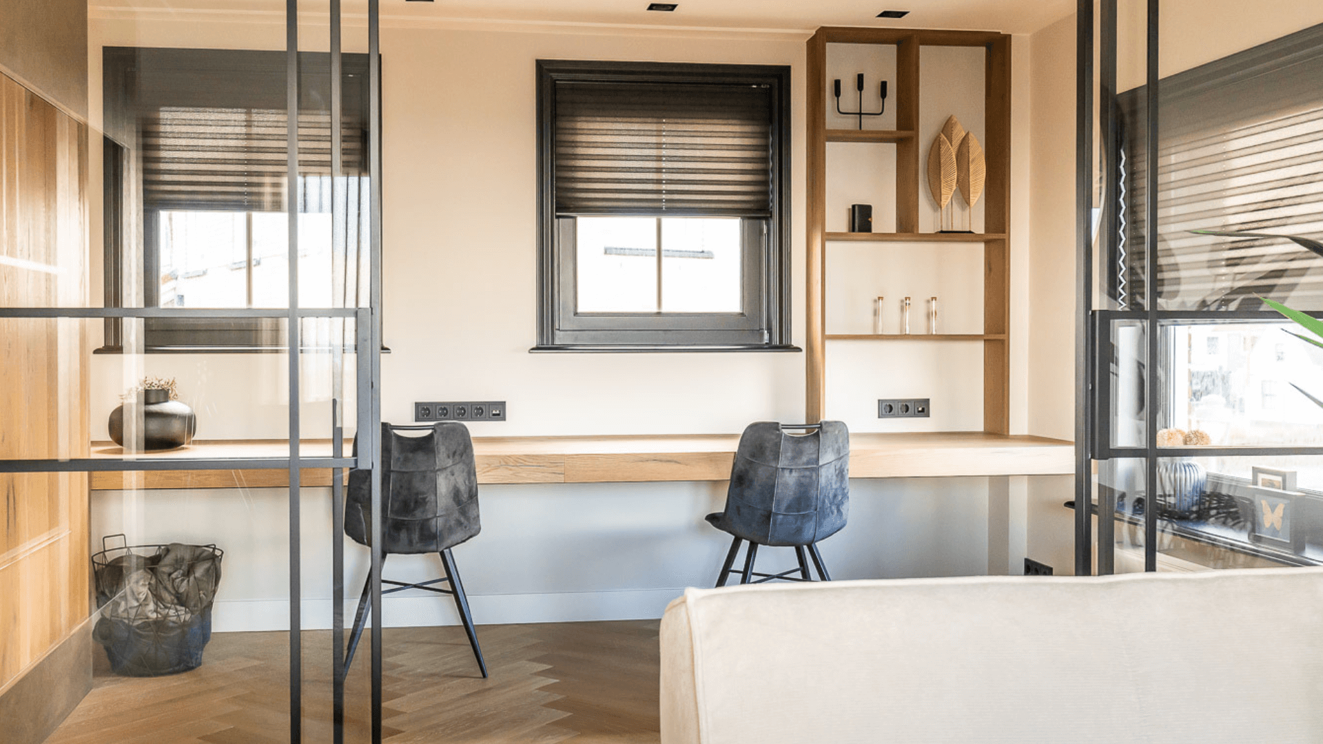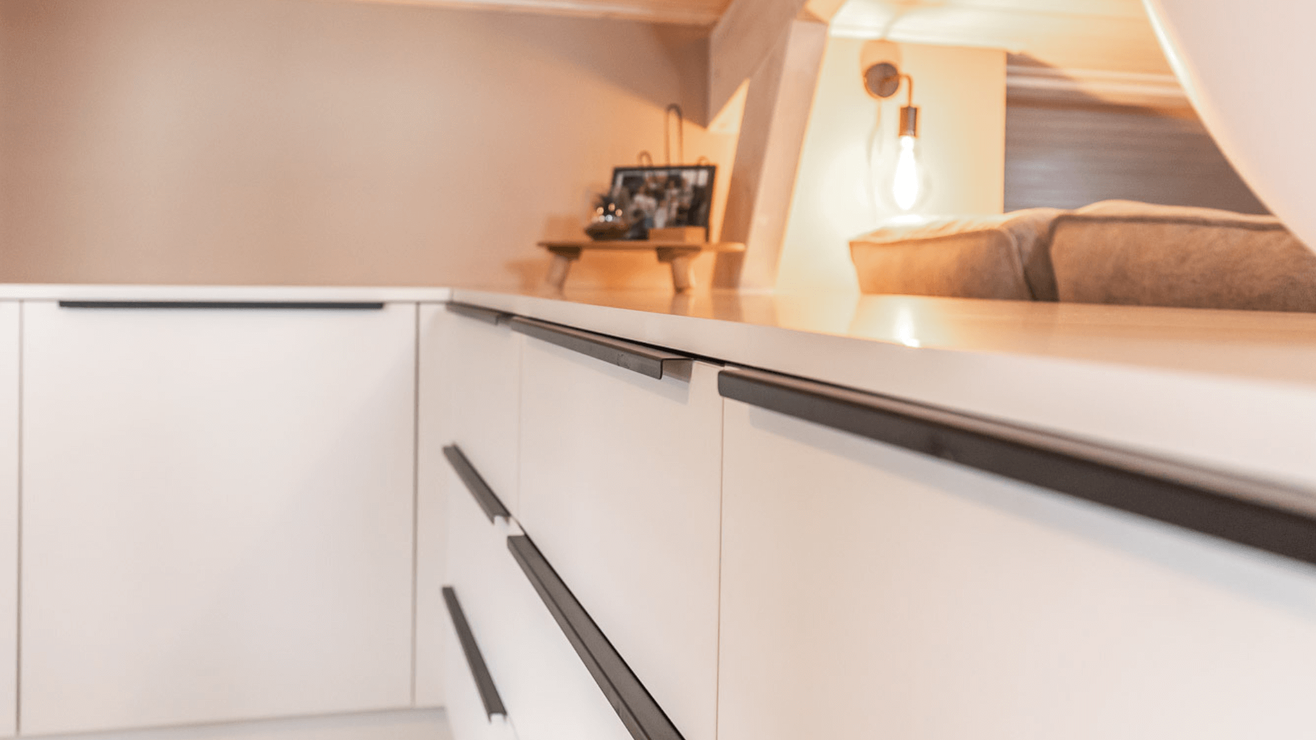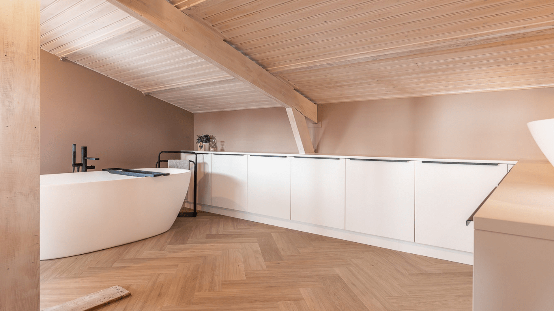 Een huis hoort er voor jou te zijn net met een maatwerk interieur wordt élke millimeter exact zoals je hem wilt. Dit huis is daarvan het perfecte voorbeeld. Het licht van de woonkeuken komt terug in het lichte interieur van de badkamer, waar de donkere handgrepen en kranen weer een subtiele verwijzing zijn naar de benedenverdieping. Een prachtig staaltje maatwerk interieur!