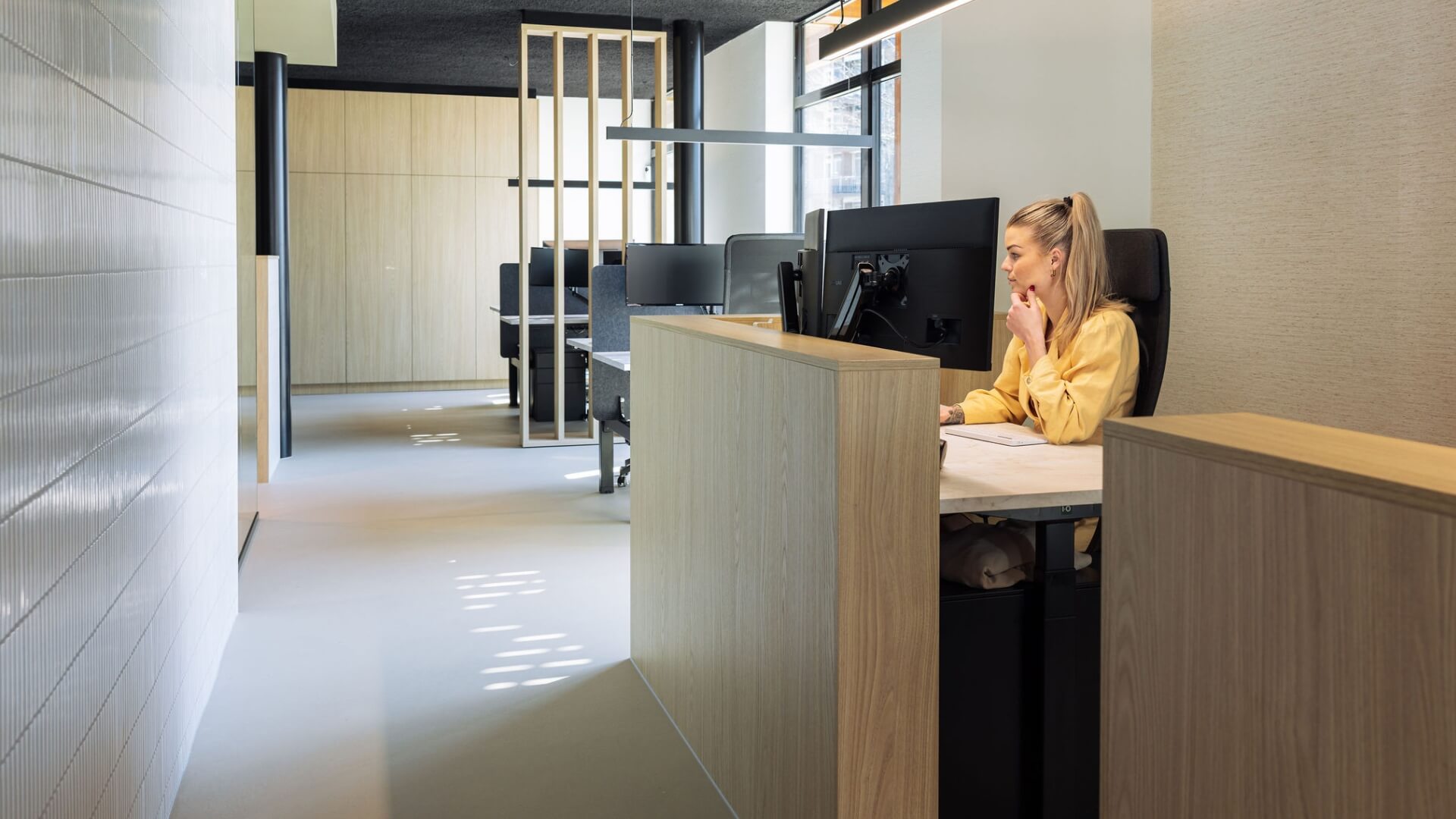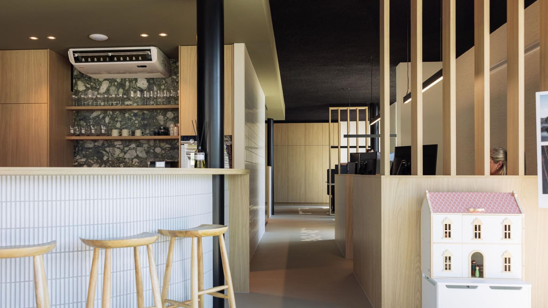 Het receptiemeubel, de kastenwand, de koffiecorner, de scheidingswanden en als echte eyecatcher de ronde bar: ze komen allemaal uit onze handen! De keuze voor lichte houtkleuren in combinatie met donkere elementen zoals het zwarte plafond zorgen dat het een alles behalve standaard interieur is geworden. Het is stoer, gewaagd en uitnodigend tegelijk. Een plek waar je niet alleen fijn kunt werken maar ook met veel trots klanten kunt ontvangen.