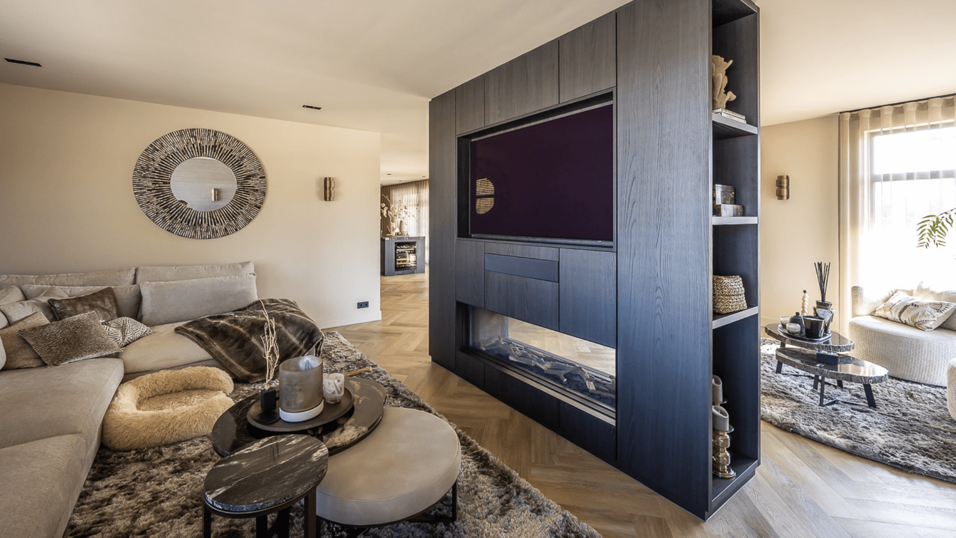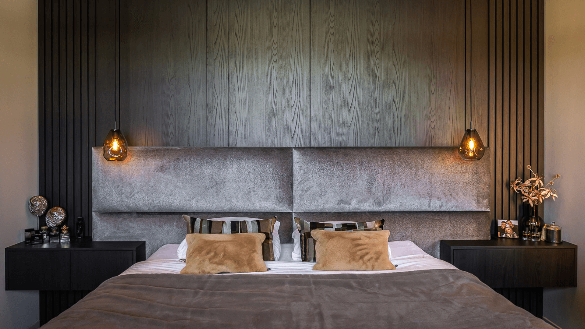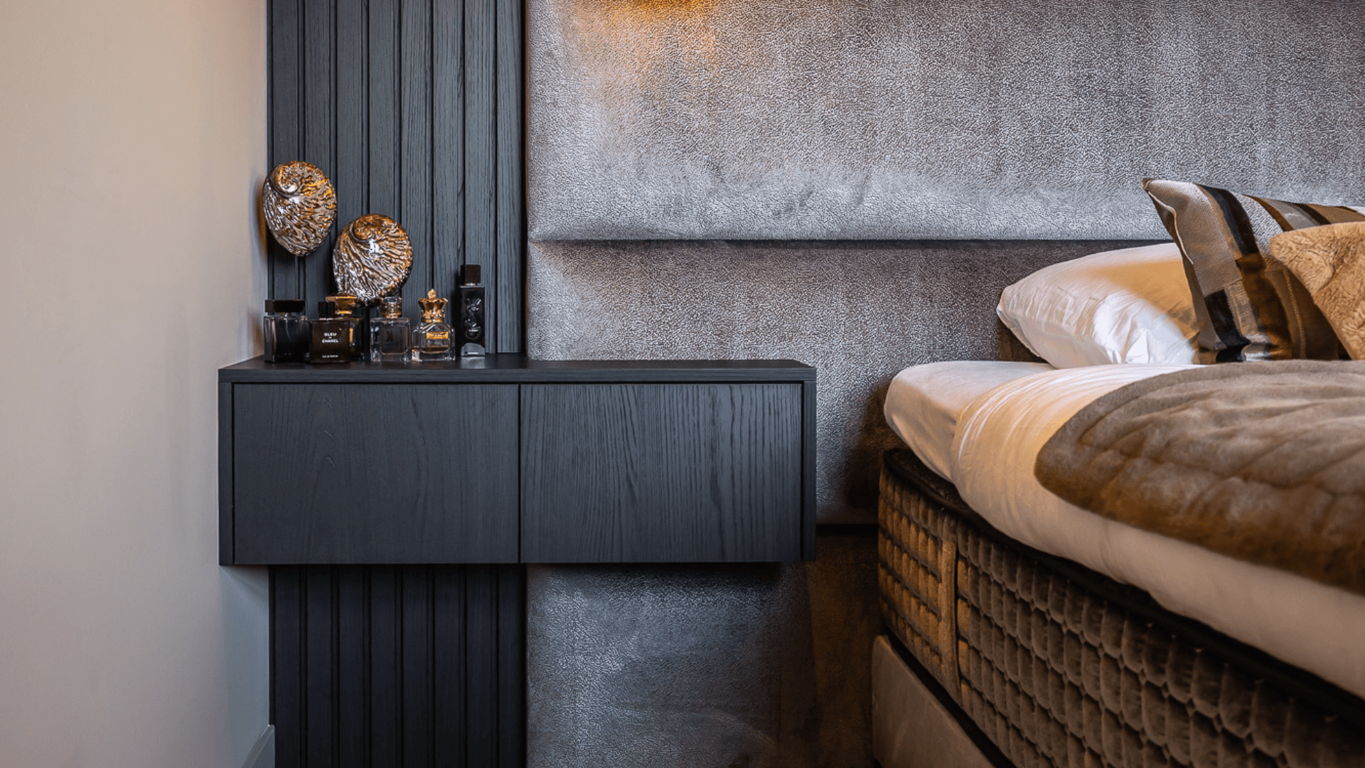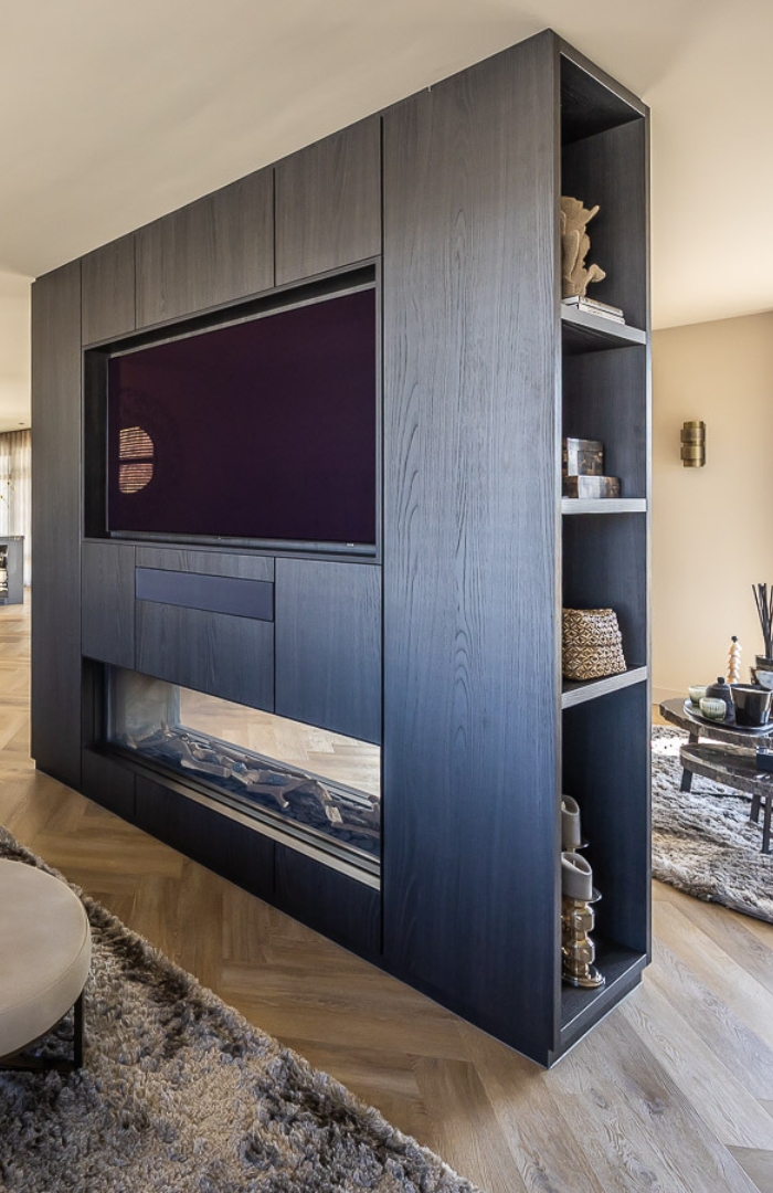 Het maatwerk haardmeubel is letterlijk en figuurlijk het stralende middelpunt van het huis. De haard verdeelt de ruimte subtiel: twee zithoeken blijven visueel verbonden, maar voelen toch als een eigen plek. Naast de inbouwhaard creëerden we een stijlvolle bar met karakter, afgewerkt met zachte rondingen, warme tinten en een inbouwhaard die sfeer geeft: ook als hij niet brandt. Ook in de slaapkamer komt het donkere materiaal terug. Hier combineerden we het met een prachtig gestoffeerd hoofdbord en zwevende nachtkastjes, zodat de wand een eenheid vormt van rust, symmetrie, gemak en comfort.