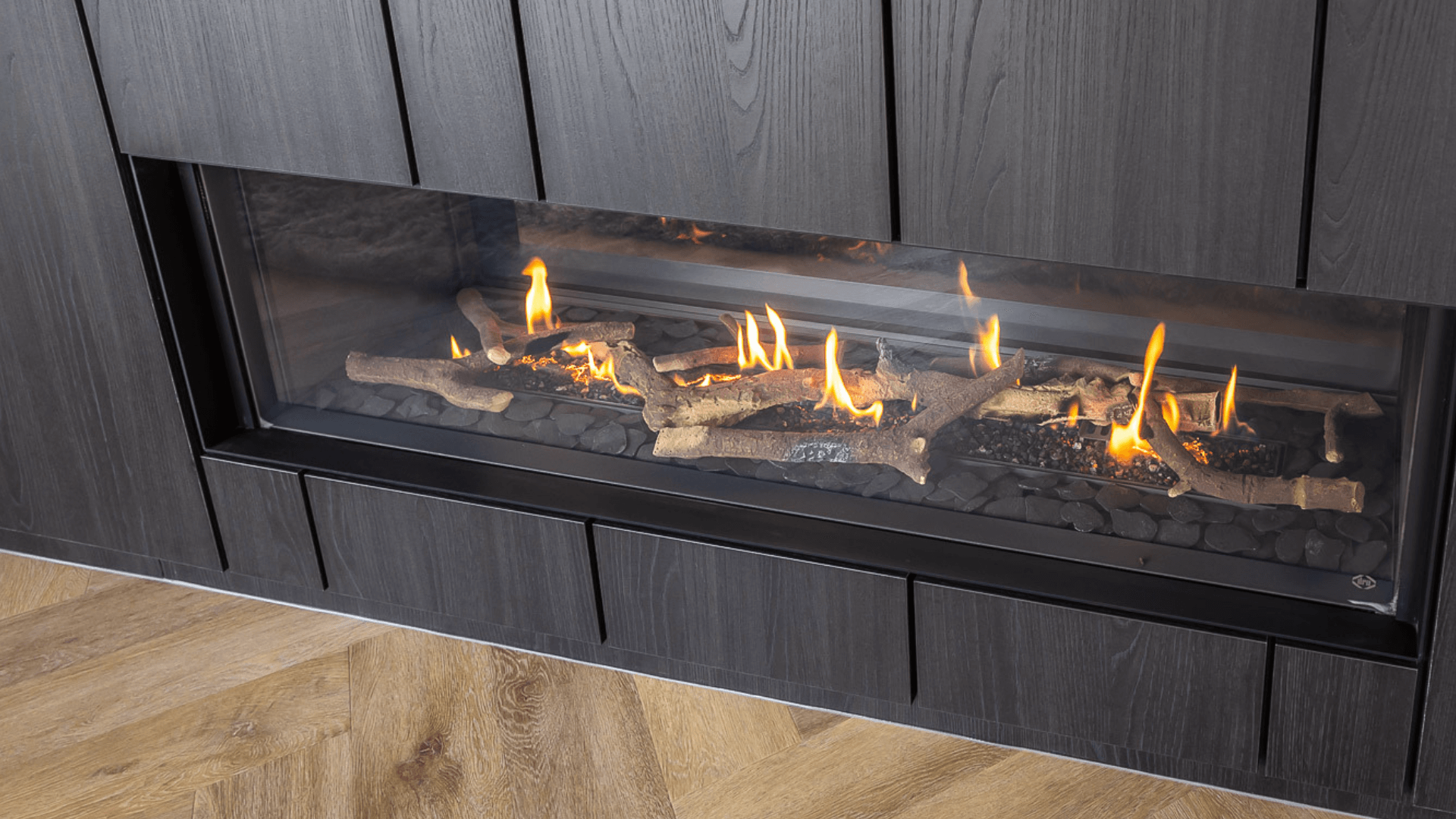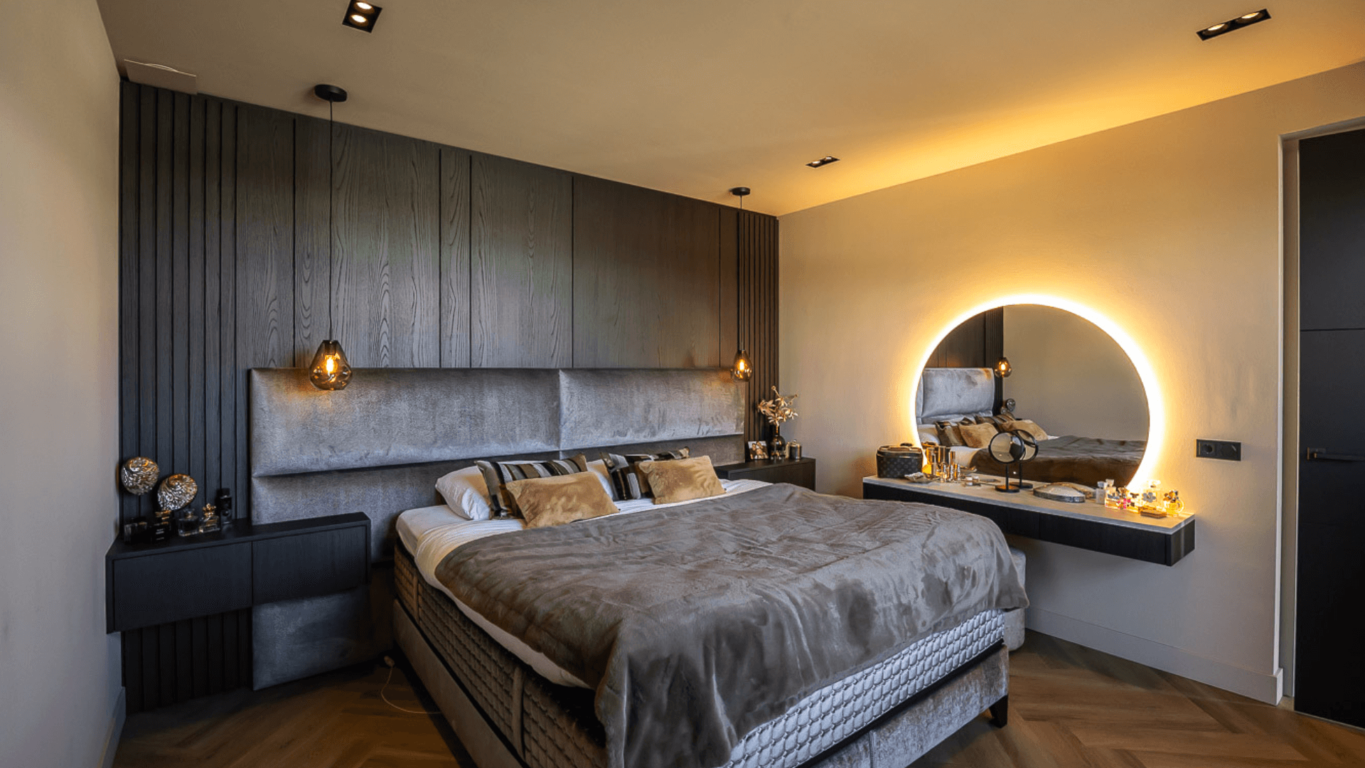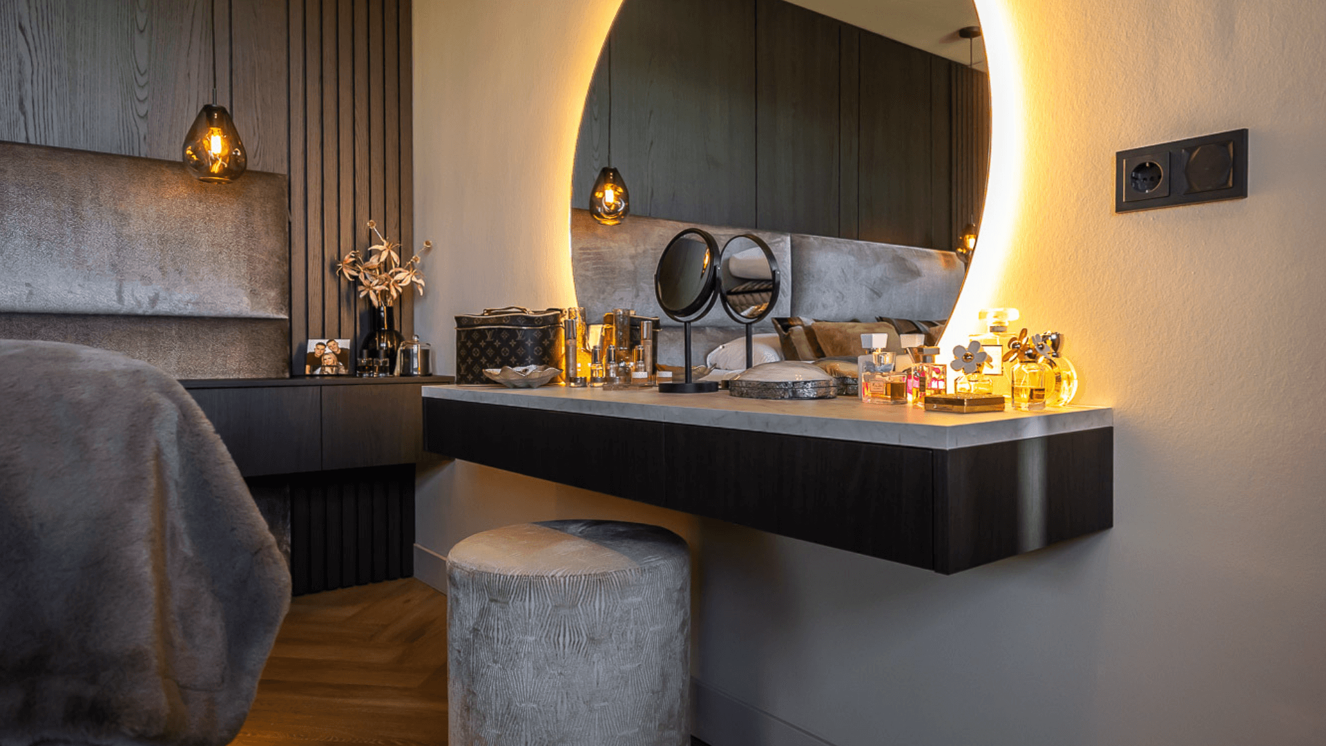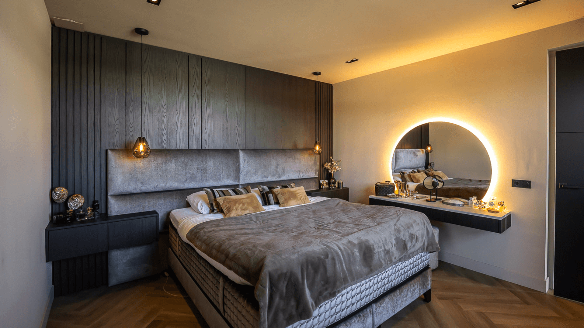 Het maatwerk haardmeubel is letterlijk en figuurlijk het stralende middelpunt van het huis. De haard verdeelt de ruimte subtiel: twee zithoeken blijven visueel verbonden, maar voelen toch als een eigen plek. Naast de inbouwhaard creëerden we een stijlvolle bar met karakter, afgewerkt met zachte rondingen, warme tinten en een inbouwhaard die sfeer geeft: ook als hij niet brandt. Ook in de slaapkamer komt het donkere materiaal terug. Hier combineerden we het met een prachtig gestoffeerd hoofdbord en zwevende nachtkastjes, zodat de wand een eenheid vormt van rust, symmetrie, gemak en comfort.