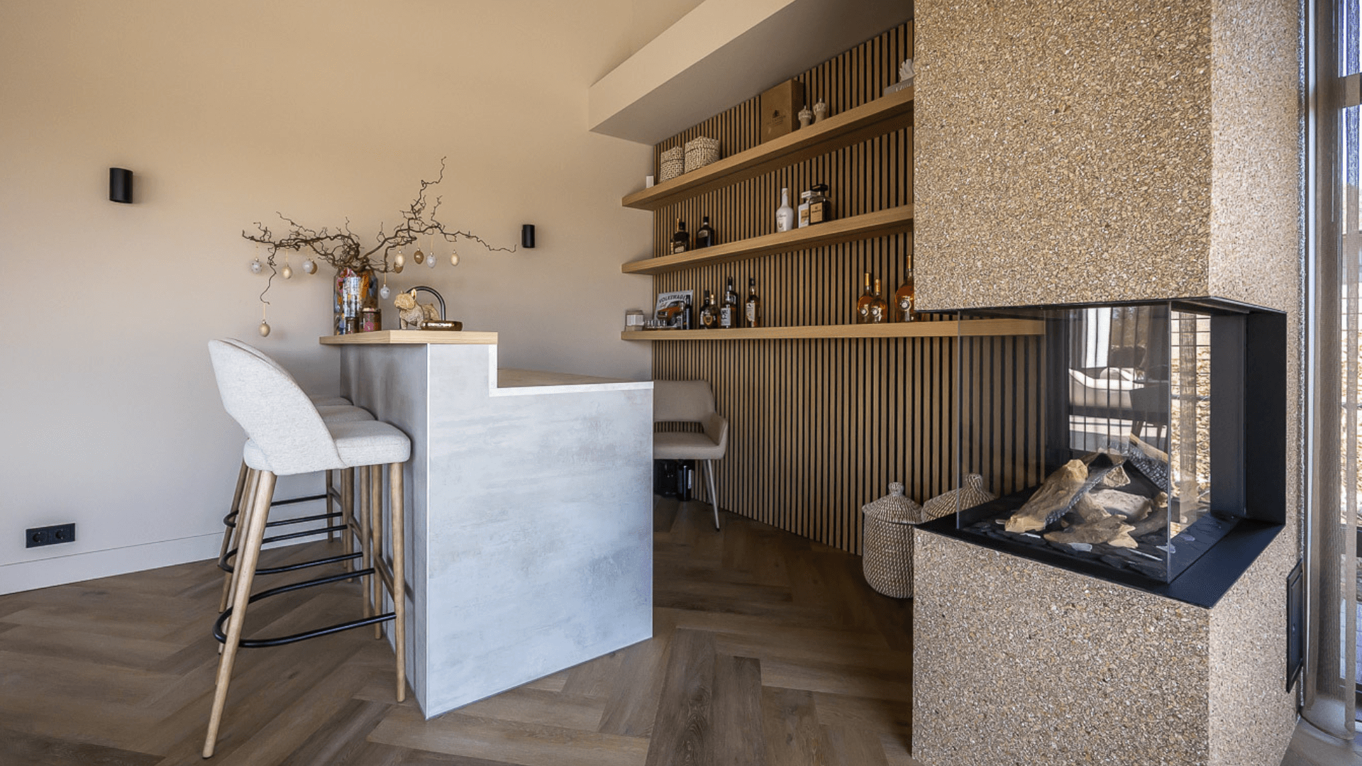 Wat dit huis in Yerseke bijzonder maakt, zit ’m in de harmonie tussen uitgesproken keuzes en subtiele afwerking. Van de warme materialen tot de ronde vormen van de bar: alles klopt en vertelt één verhaal. En dat is precies waar wij blij van worden. Interieurs bouwen die naadloos passen bij de wensen van de bewoners én waar het vakmanschap vanaf straalt: van haardmeubel tot slaapkamerwand.