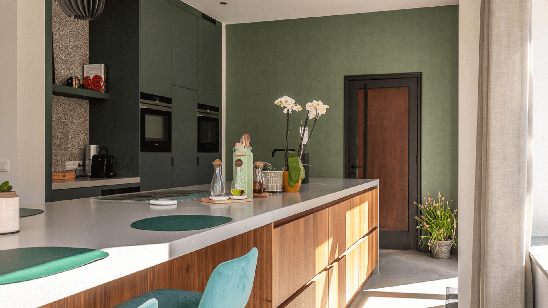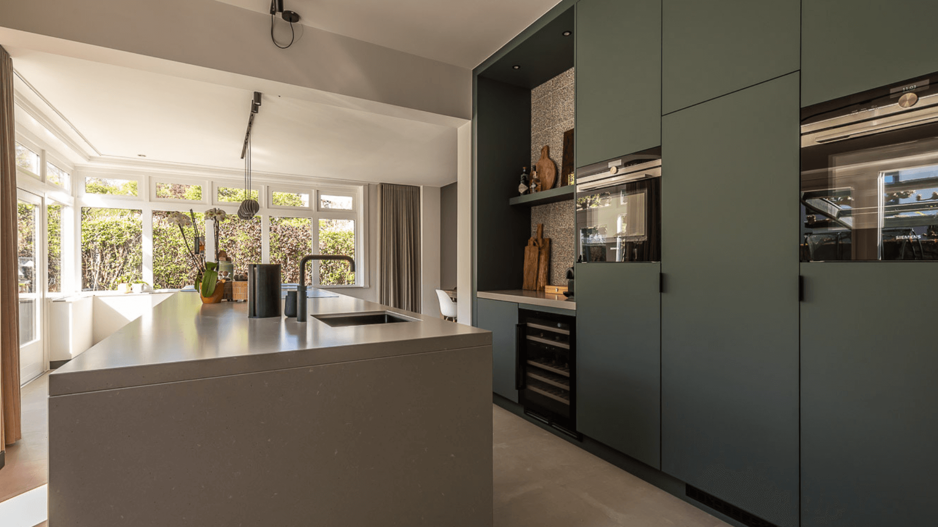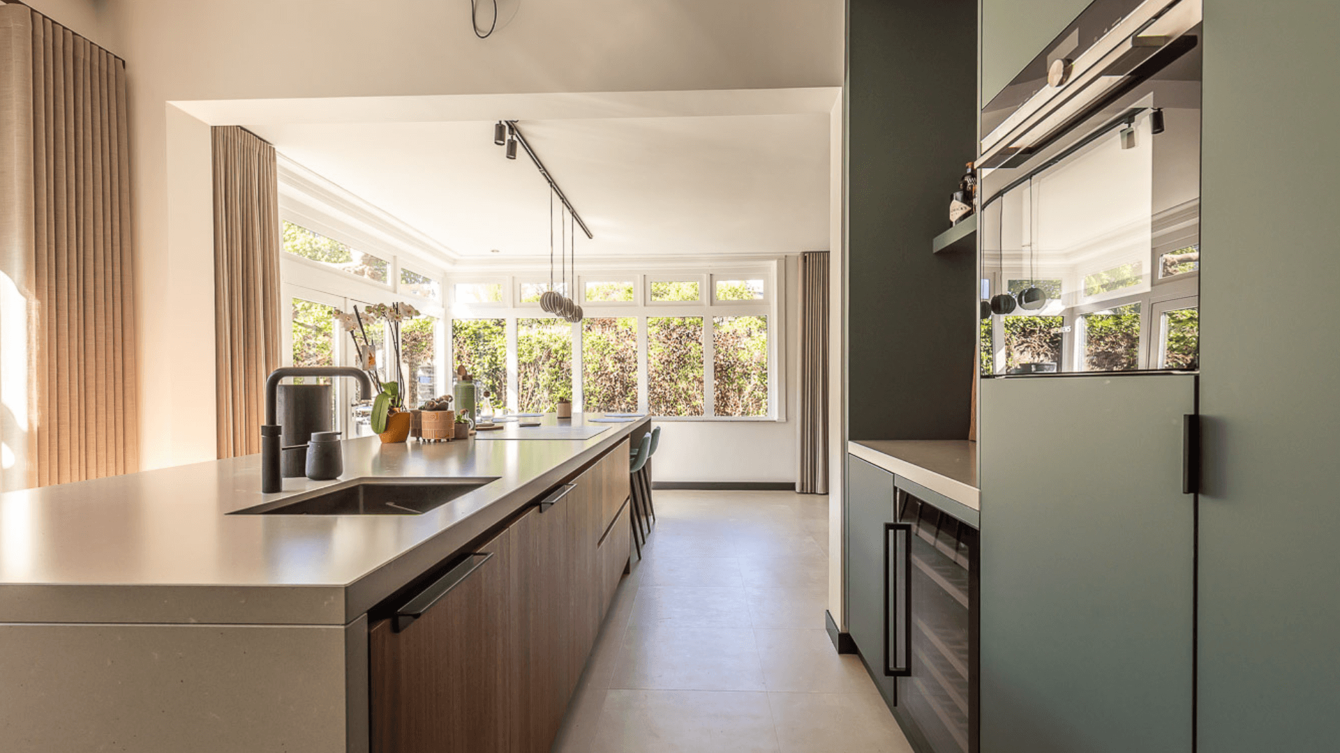 De donkergroene inbouwkasten vormen een stijlvol contrast met het lichte blad en het houtfineer van het eiland. Aan dat eiland is genoeg plek om te zitten – voor ontbijt, koffie of spelletjes. Het licht stroomt naar binnen via de grote ramen en maakt van de keuken het stralende middelpunt van het huis.