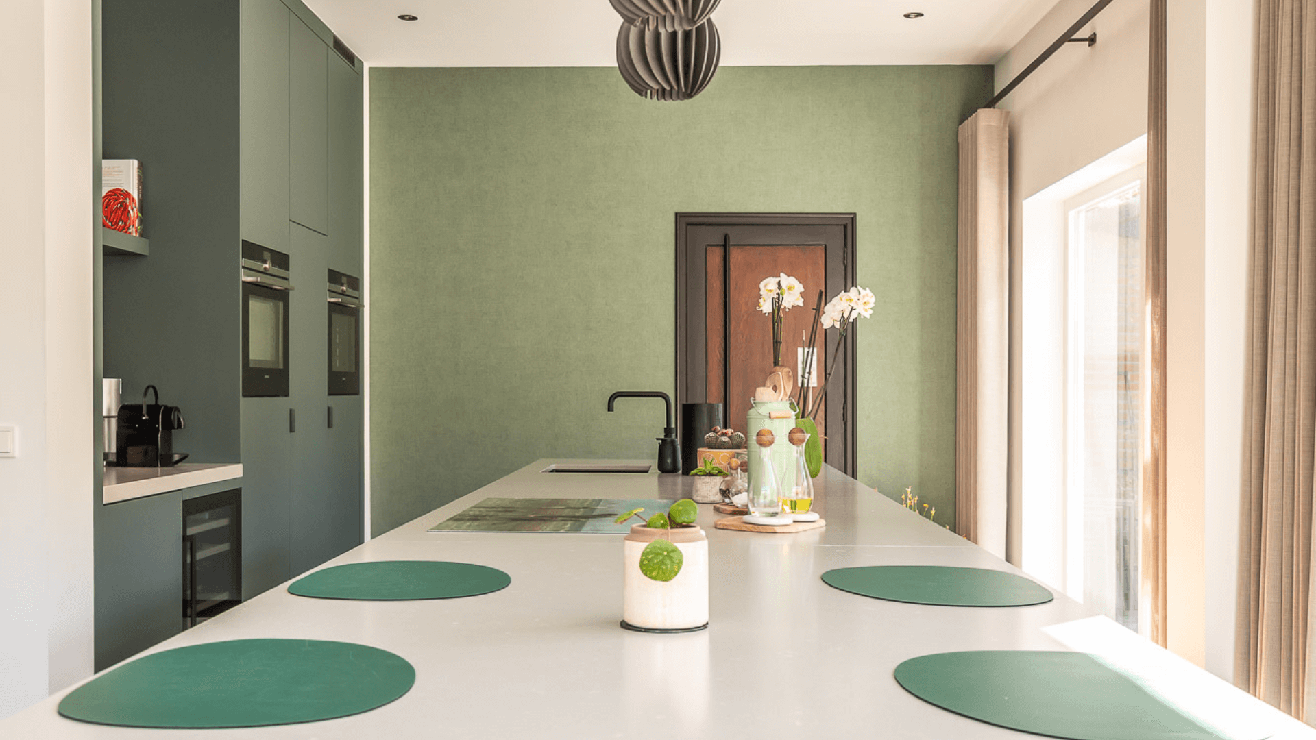 De donkergroene inbouwkasten vormen een stijlvol contrast met het lichte blad en het houtfineer van het eiland. Aan dat eiland is genoeg plek om te zitten – voor ontbijt, koffie of spelletjes. Het licht stroomt naar binnen via de grote ramen en maakt van de keuken het stralende middelpunt van het huis.