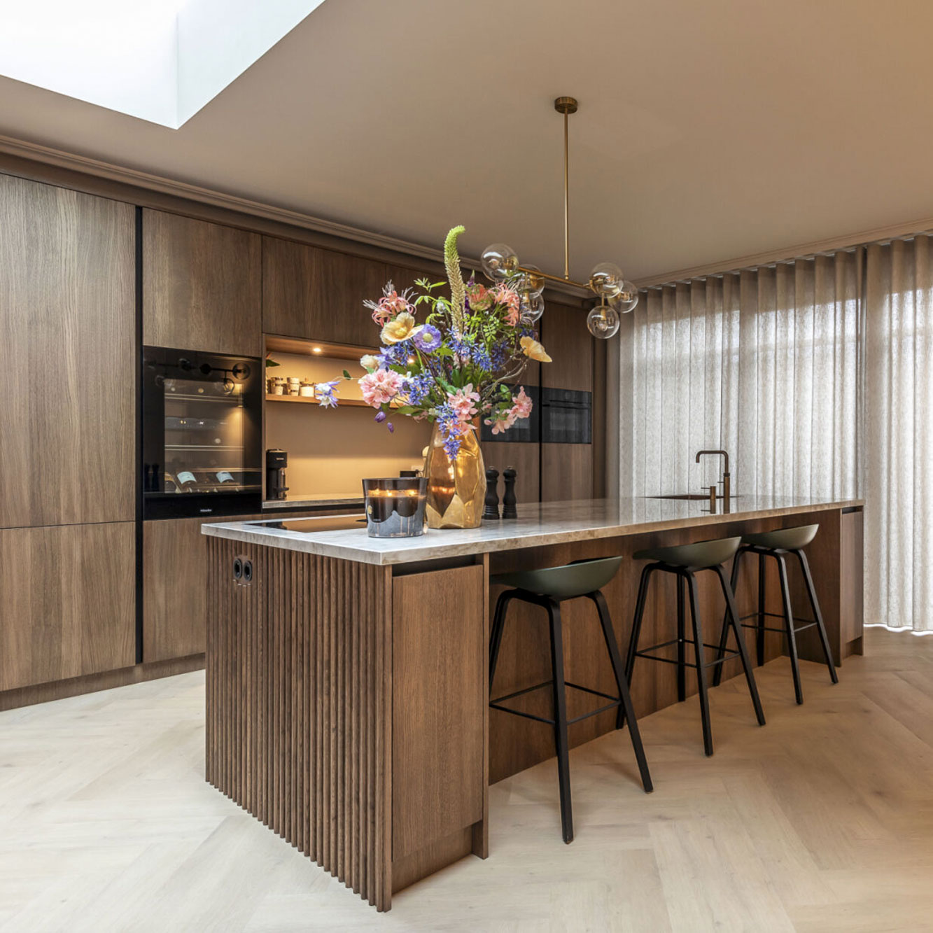 Deze keuken is ontworpen door een interieurarchitect en tot in de puntjes uitgewerkt en geplaatst door ons team. Achter de strakke fronten schuilt voldoende opbergruimte. Van wijnklimaatkast tot koffienis: alles zit erin. Het resultaat? Een leefruimte die luxe uitstraalt én moeiteloos meebeweegt met het drukke gezinsleven.